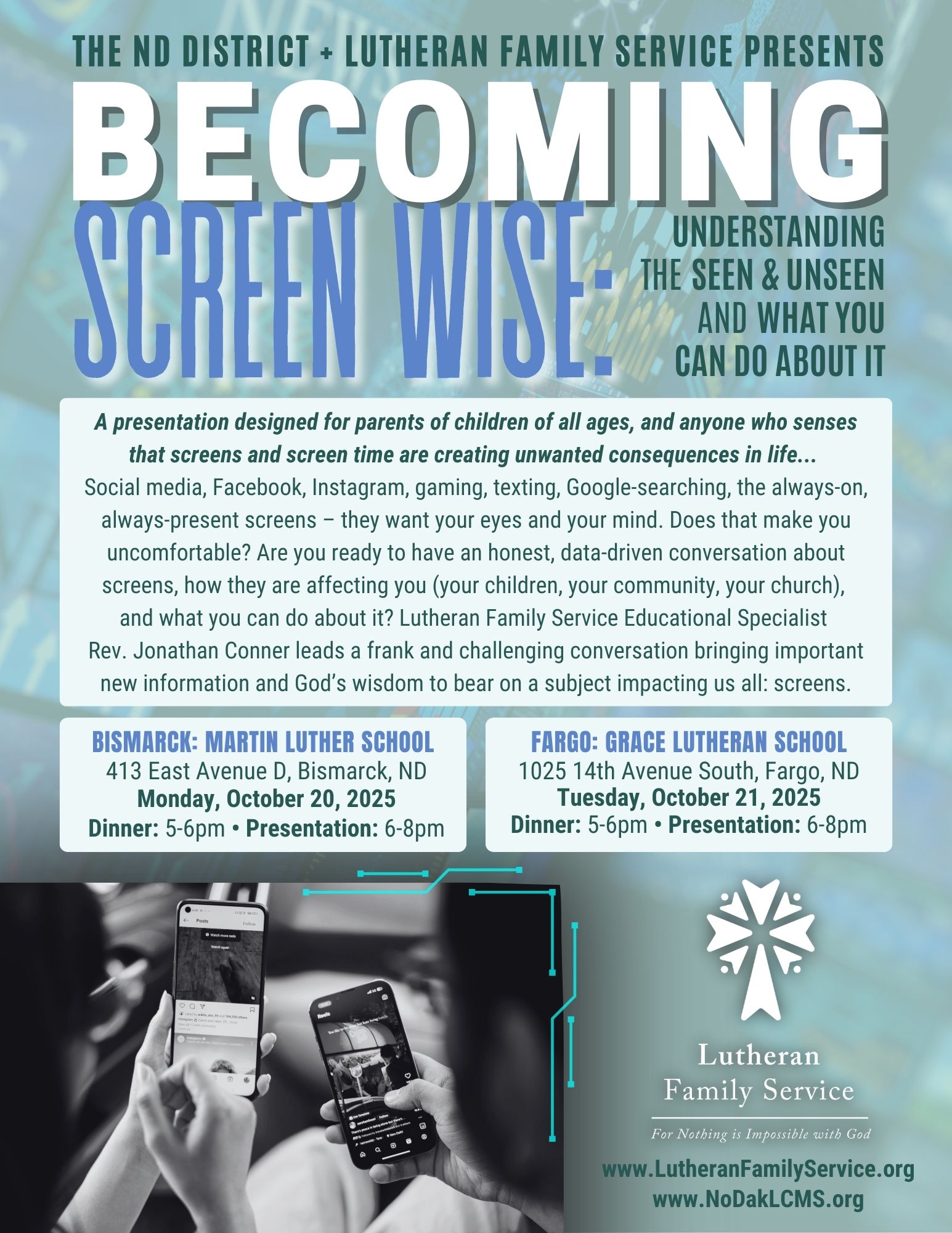 Social media, Facebook, Instagram, gaming, texting, Google-searching, the always-on, always-present screens – they want your eyes and your mind. Does that make you uncomfortable? Are you ready to have an honest, data-driven conversation about screens, how they are affecting you (your children, your community, your church), and what you can do about it? Lutheran Family Service Educational Specialist Rev. Jonathan Conner leads a frank and challenging conversation bringing important new information and God’s wisdom to bear on a subject impacting us all: screens.