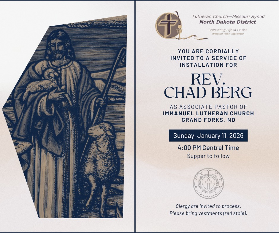 Please join us for the installation of Rev. Chad Berg as Associate Pastor at Immanuel Grand Forks on Sunday, January 11 at 4:00pm. A meal will follow. Clergy are invited to process (please bring vestments).