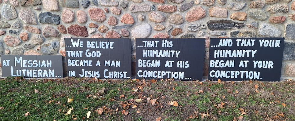 March 25 is Annunciation Day, the day on which we remember Jesus' conception at the angel's visit to Mary. It is a perfect day for Christians to tell our world that Jesus' humanity informs us of our humanity. The Bismarck Mandan Chapter of Lutherans for Life will prepare, for any church that requests it, a series of four placards for members to hold (or for a church to plant or to post, weather permitting) as a curbside witness.