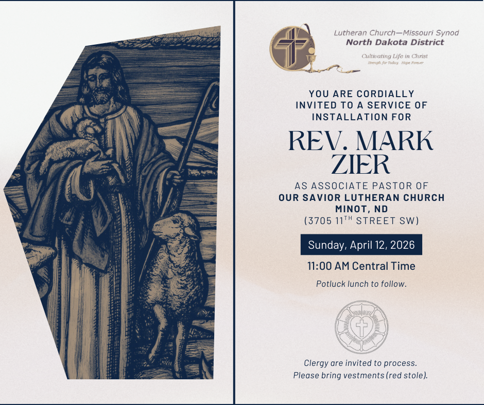 Please join us for the installation service & potluck reception for Pastor Mark Zier, Sunday, April 12, 11am, at Our Savior Lutheran Church in Minot.