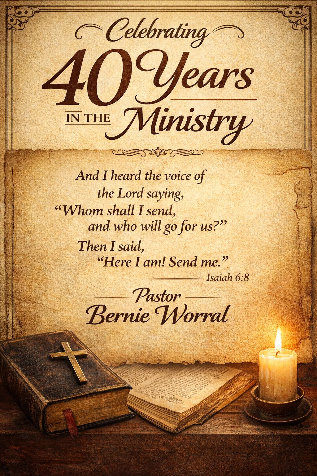 April 26th 2026 will be the 40th anniversary of Rev. Bernie Worral's call into the ministry. His first parish was in Chadron, Nebraska. He then took the call to Immanuel Fargo 1991 and has served there ever since. What a journey rich in the favors of God's blessings!