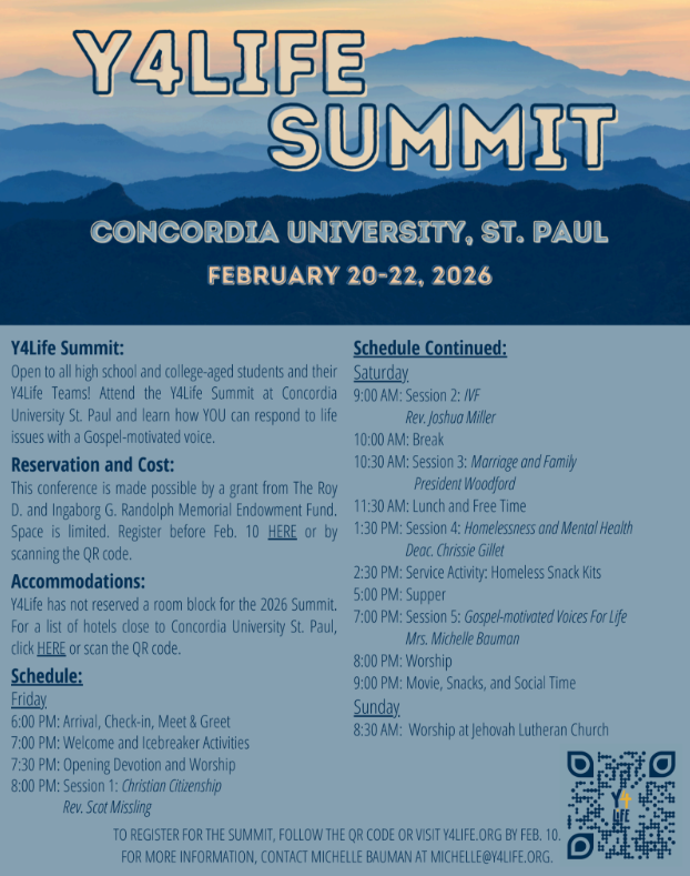 The Y4Life Summit is an annual educational event that equips youth to uphold the lives of others through education, service, worship, and celebration. This year, it will be held at Concordia University in St. Paul, Minnesota, from February 20-22. Filled with educational sessions and hands-on opportunities to support life, including making kits and blankets for the unhoused, this conference offers college and high school youth an opportunity to transform their beliefs into actions and build deep relationships with other life-affirming youth. Youth from across the nation will learn about the life-affirming benefits of marriage and family, the complex intersection between mental health and homelessness, and how to engage as a compassionate Christian citizen in a world broken by sin.