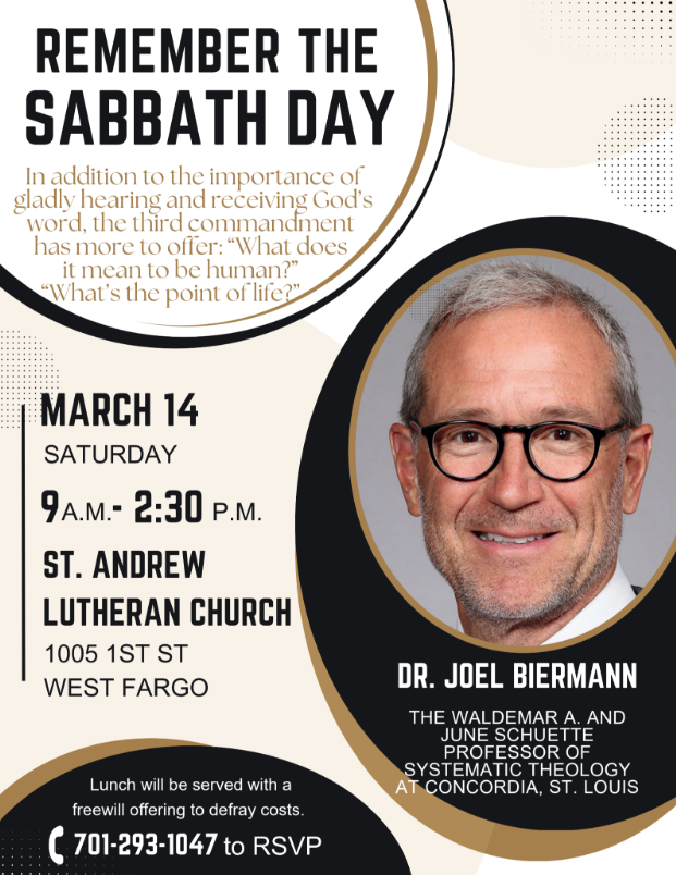Dr. Joel Biermann, the Waldemar A. and June Schuette Professor of Systematic Theology at Concordia Seminary, St. Louis, will discuss a broader understanding of sabbath from 9 a.m. to 2:30 p.m. Saturday, March 14, at St. Andrew Lutheran Church, 1005 First St., West Fargo, ND, 58078. The event is free. A lunch will be served with a freewill offering to defray costs. Please RSVP at office@bslcfargo.org or call (701)293-1047.